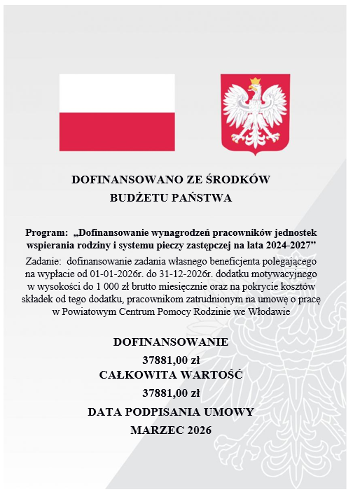 Zgodnie z Umową Nr 1907w sprawie dofinansowania zadania własnego powiatu realizowanego w ramach rządowego programu „Dofinansowanie wynagrodzeń pracowników jednostek wspierania rodziny i systemu pieczy zastępczej na lata 2024-2027” Wojewoda Lubelski przyznał Powiatowi Włodawskiemu środki finansowe w formie dotacji celowej, w tym w ramach działu 855, w tym w rozdziale 85508 § 2130 została przyznana kwota 37881,00 zł.